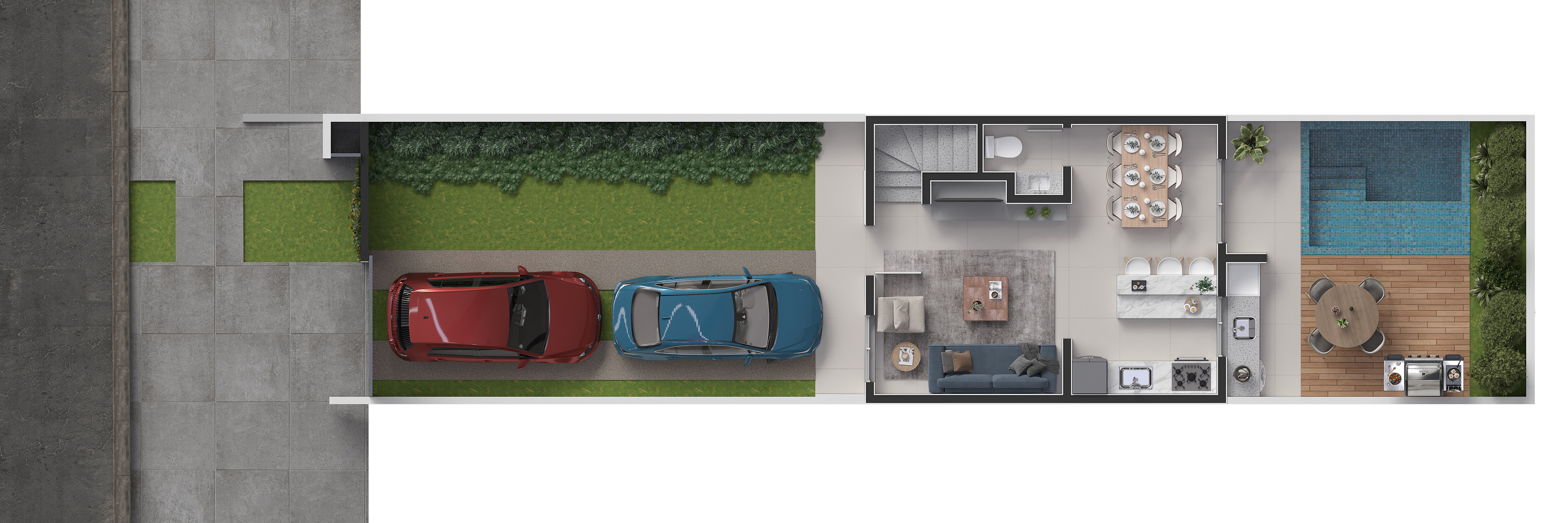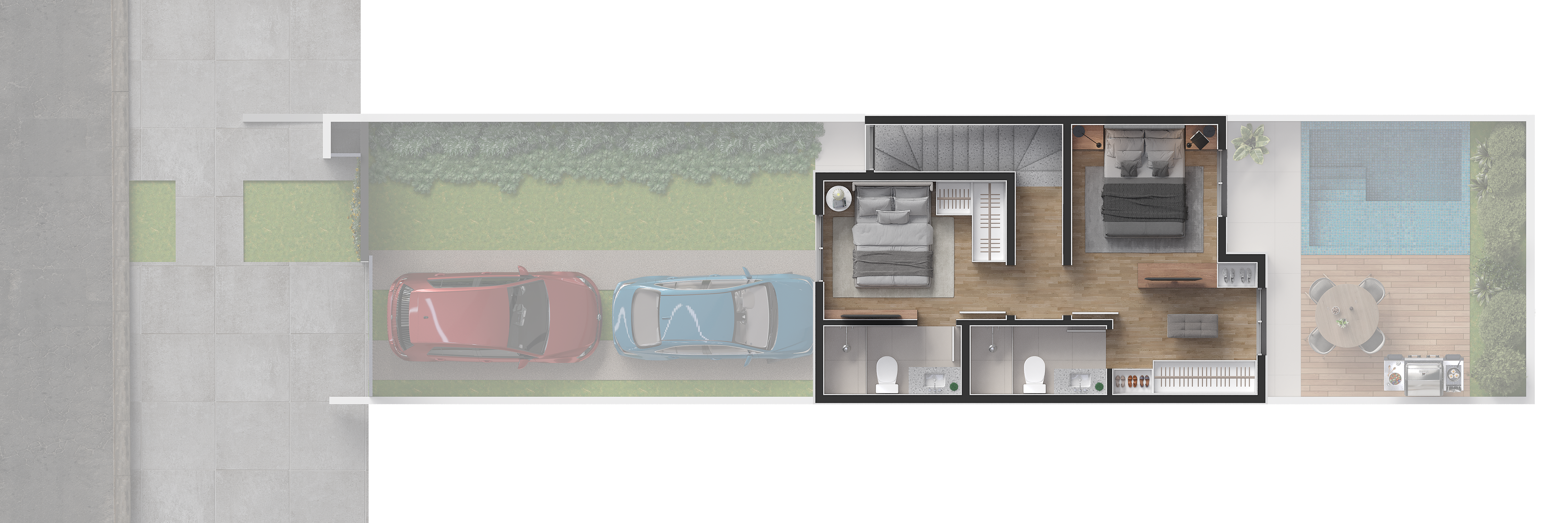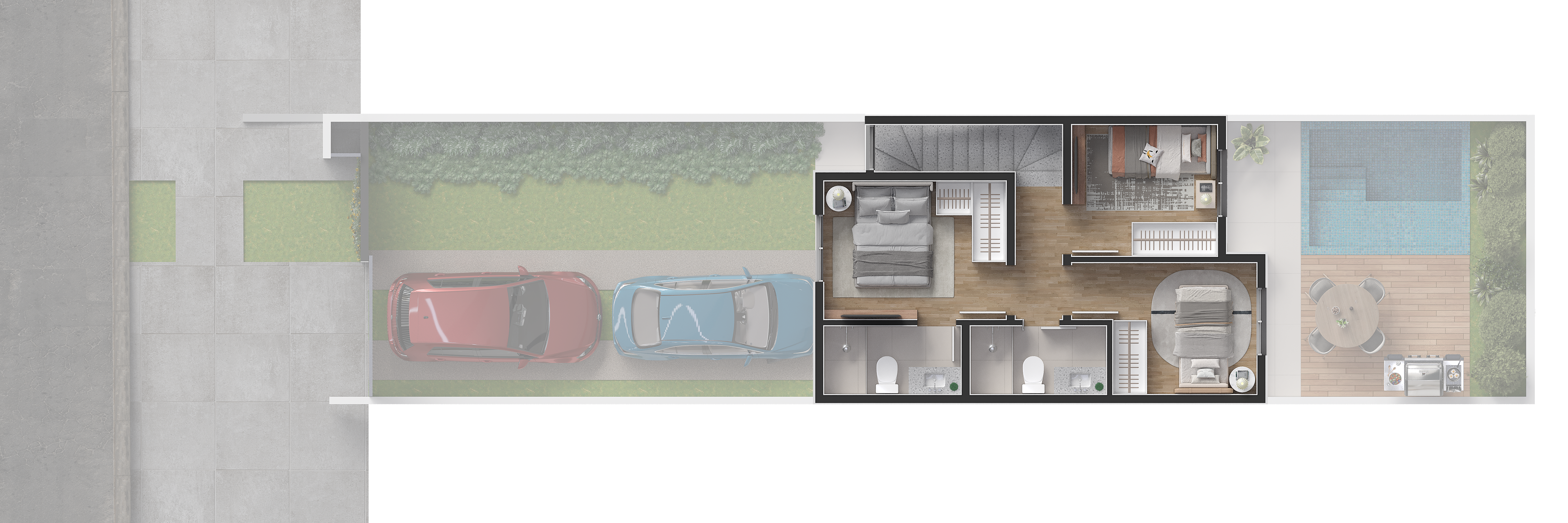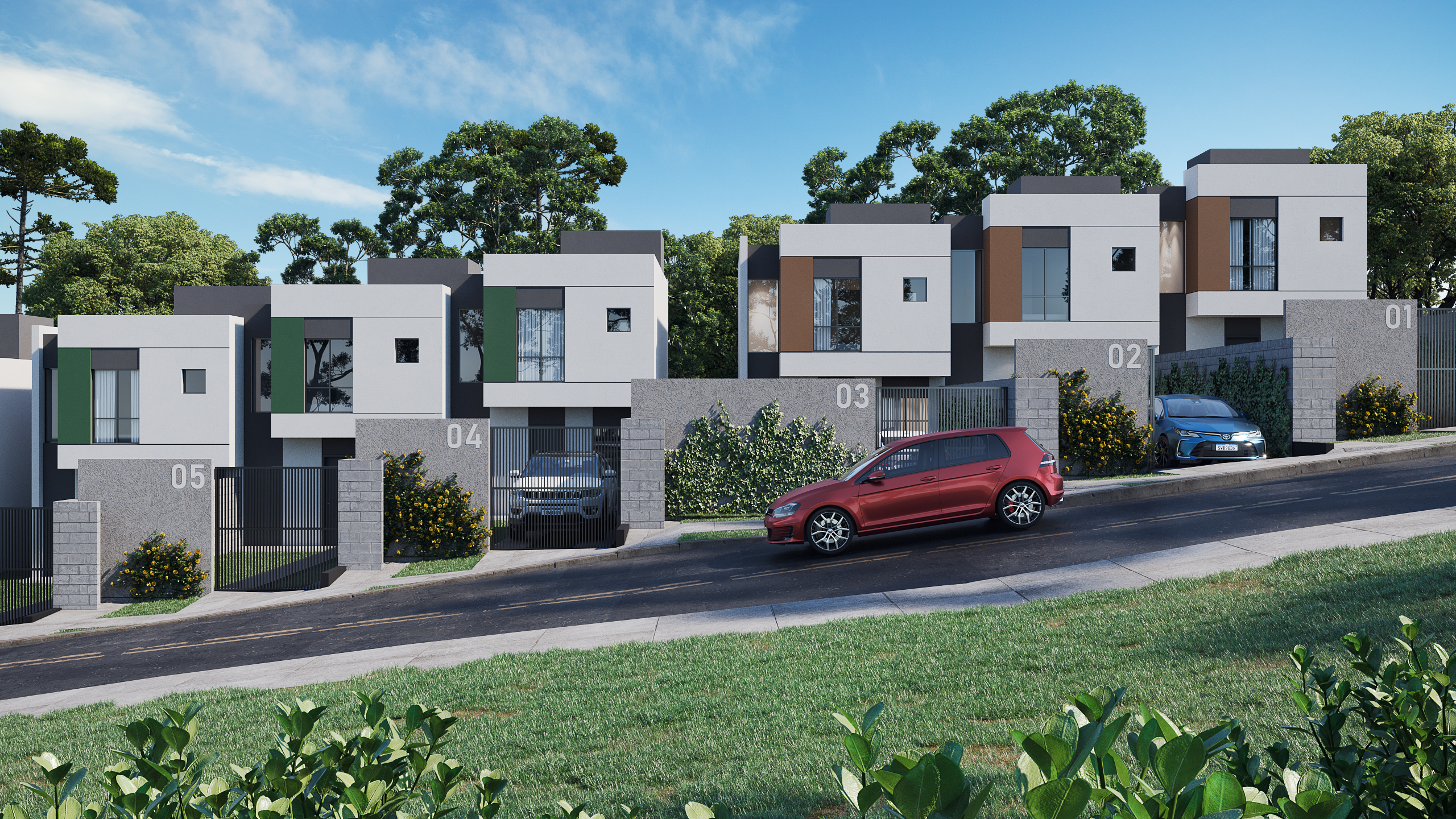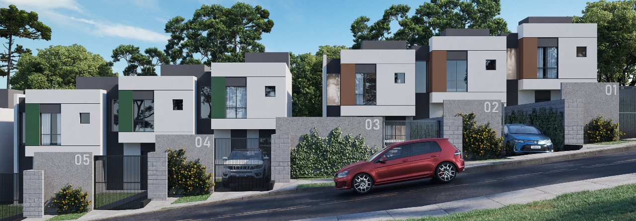 Cada casa possuí capacidade para até 4 vagas de garagem, além de um amplo espaço de terreno nos fundos.